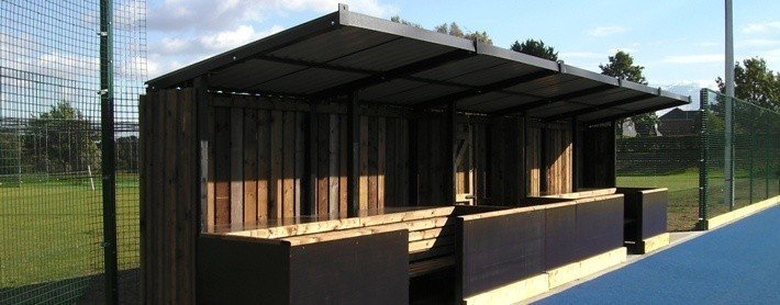 Custom built to suit the application in terms of length and width and cladding, AlphaFence produces a range of Team Shelters and Spectator Buildings. Typically each has a home, away and umpire compartment with timber bench seating. The buildings are roofed and clad on the back and sides with overlapping timber verticals. |